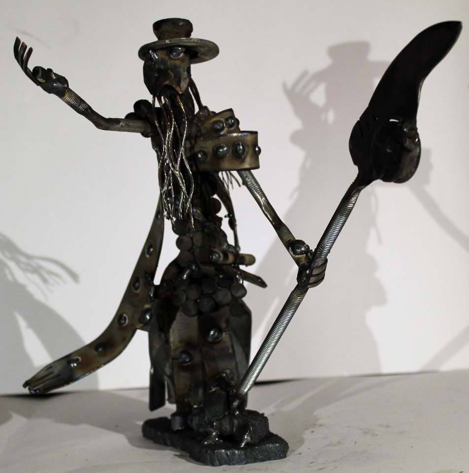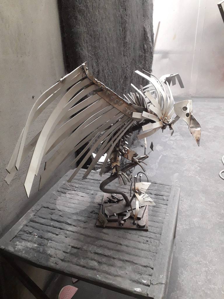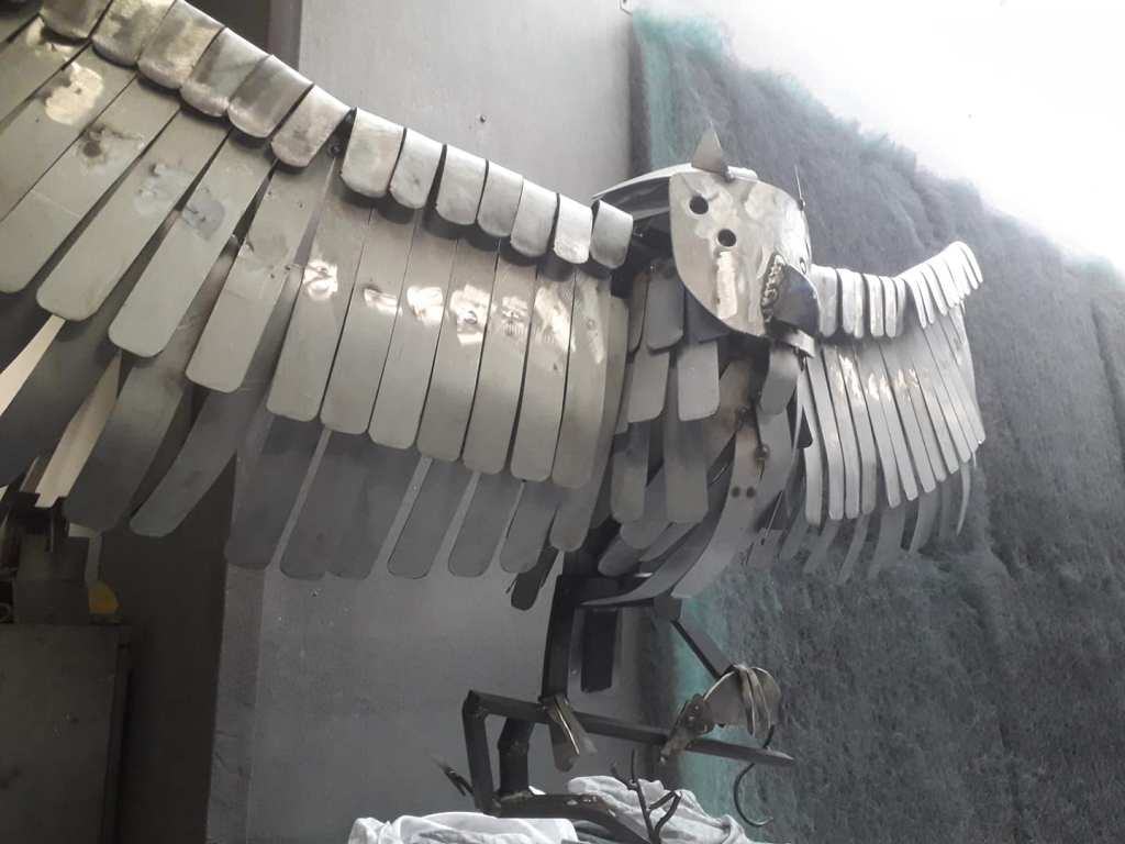 Cette statue d’une hauteur de 60 centimètres et d’une envergure d’un mètre vingt, déploie ses ailes de tôles pliées, fier de sa proie nouvellement capturée.